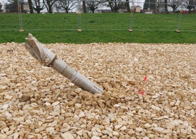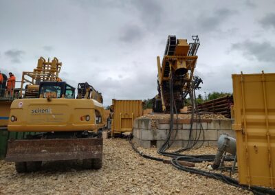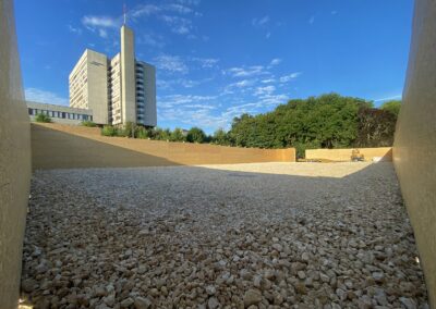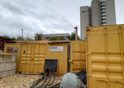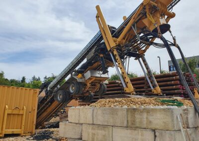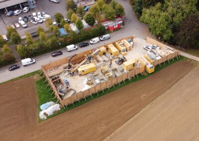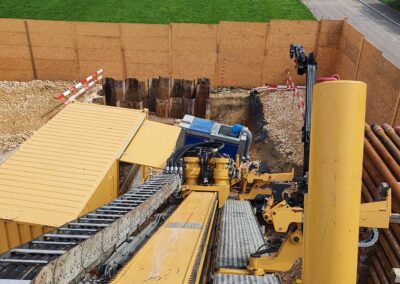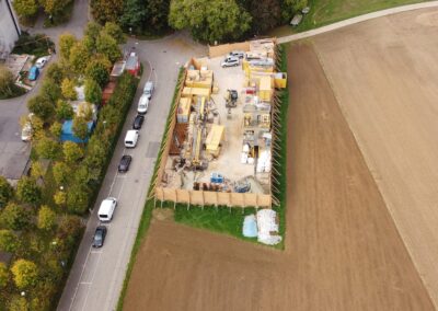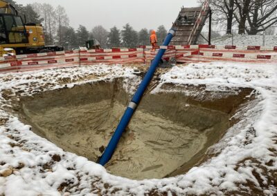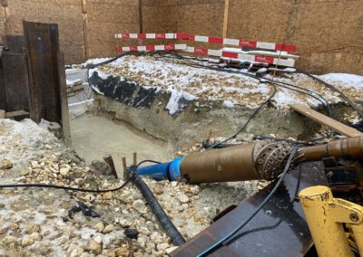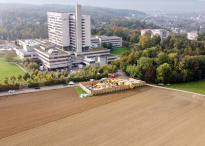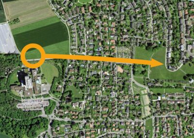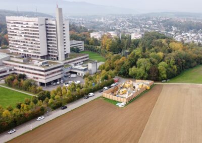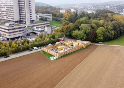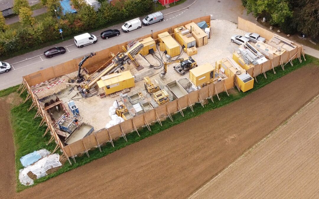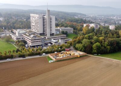 Die IWB projektierte zwischen dem Kantonsspital Bruderholz und dem Wasserturm Bruderholz eine neue Trinkwasserleitung. Dafür wurde eine gesteuerte Horizontalspülbohrung angewandt. Beim startseitigen Installationsplatz wurden Holzwände, welche die Häuser und den Spital in der Umgebung vor Lärm abschirmen sollen, hochgezogen. Die Anwohner bemerkten von den Arbeiten sowieso nichts, denn gebohrt wurde in bis zu 50 m Tiefe. Die Einstichstelle befand sich auf Binninger Boden, rund 50 m nördlich des Bettenturms des Bruderholzspitals. Wieder ans Tageslicht kam der Bohrkopf rund 800 m weiter östlich, auf baselstädtischem Boden, beim Wasserturm Bruderholz.