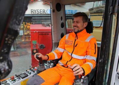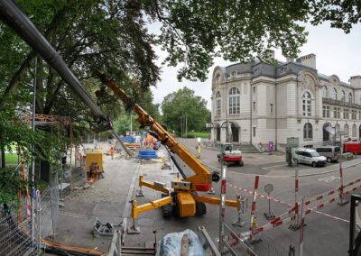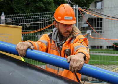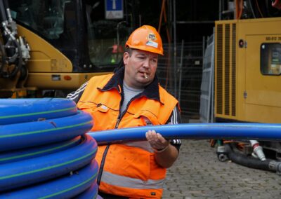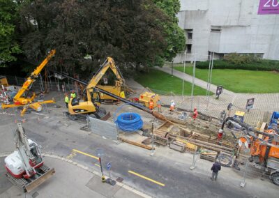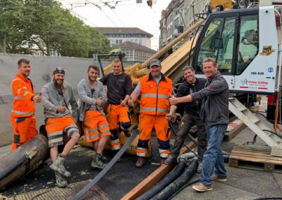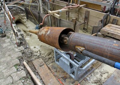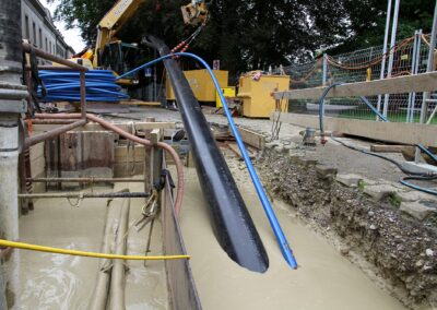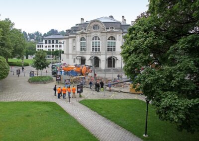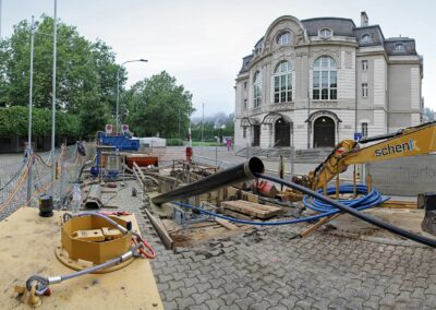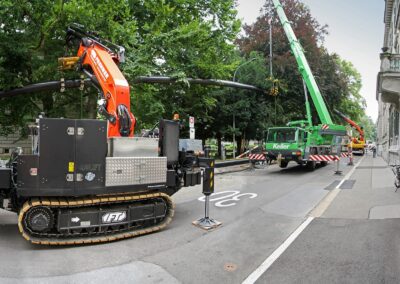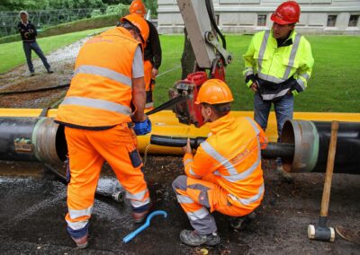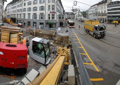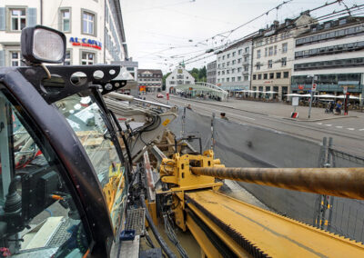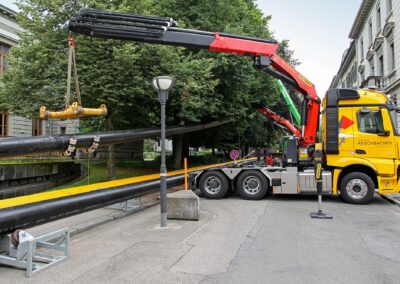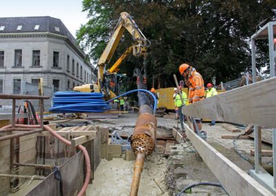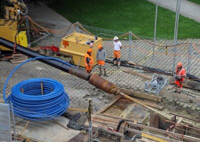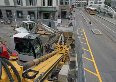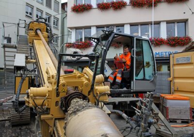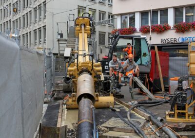 Um die Emissionen im Zentrum der Stadt St.Gallen möglichst gering zu halten, haben sich die St.Galler Stadtwerke für eine grabenlose Art des Leitungsbaus entschieden. Wir bohrten von der Startgrube an der Museumstrasse 24 ein Loch bis zur Zielgrube am Marktplatz 4. Der dabei entstandene unterirdische Kanal ist rund 350 Meter lang und befindet sich am tiefsten Punkt fast 30 Meter unter der Erde. Durch diesen Kanal haben wir ein Schutzrohr eingezogen, später dann der Einzug der eigentlichen Gasleitung. Das vor dem Einzug zusammengeschweisste Stahlrohr konnte mit Hilfe mehrerer Baukräne genau im richtigen Radius zum Bohrloch eingeführt werden.